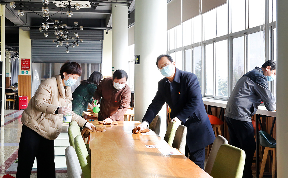 为了做好疫情常态化防控,保障师生身体健康安全,3月5日上午,教工第一党支部组织全体党员开展“细心呵护、保驾护航主题党员活动日”活动,深入学生餐厅做好环境卫生清洁和消毒。