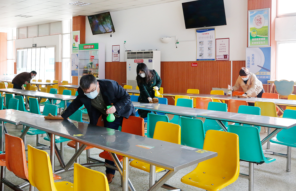 全体党员手拿清洁消杀工具,在各自的岗位上干的热火朝天,对餐厅桌椅、地面等重点区域进行全面的扫、抹、拖、擦。党支部班子靠前指挥,仔细检查卫生,确保餐厅环境卫生。通过全体党员共同努力,学生餐厅环境焕然一新,整洁有序。