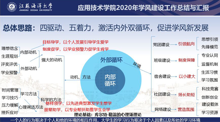 作为学生数最多,专业教师数最少的学院,我院近年来一直致力于探索一套适合学院特色的学风建设机制。经过不停地探索与实践,学院根据库尔特·勒温的心理场理论,结合学院实际情况,建立了一套较为完整的学风建设总体思路:也就是四驱动、五着力,激活内外双循环,促进学风新发展。内部循环的四驱动是指以理想信念教育和生涯规划教育为主的内部动机和以评奖评优和学业预警为主的外部动机;以时间管理和学习技巧为主的学习方法和以压力缓解与挫折应对为主的心理调适。外部循环的五着力是指加强党团建设,着力引领航向;加强班级建设,着力制度保障;加强宿舍文化建设,着力习惯养成;加强社团建设,着力个性发展;加强网络建设,着力氛围营造。