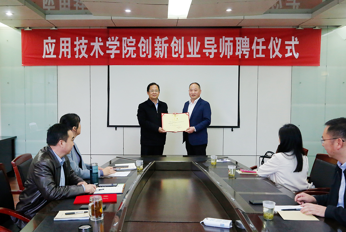 4月23日上午,学院创新创业导师聘任仪式在行政楼三楼会议室举行。江苏乐普科技有限公司董事长、江苏海洋大学镇江校友会会长周华和连云港市亚桥机械制造有限公司总经理、江苏海洋大学连云港校友会副会长翟怀前应邀参加,聘任仪式由学院党委书记周清华主持,学院党委副书记万金店、副院长隋福利、教学办同志出席聘任仪式。