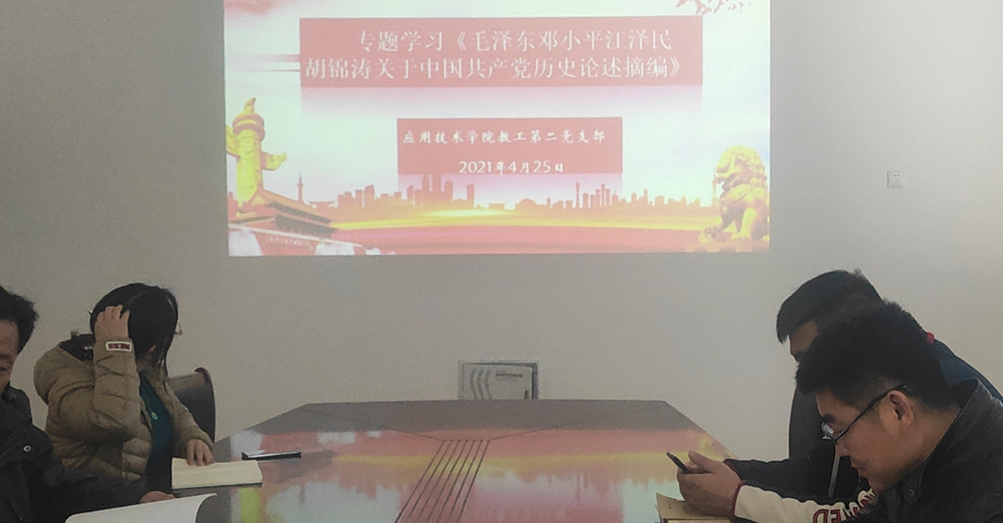 4月25日下午,教工第二党支部在厚德楼206召开专题会议学习《毛泽东邓小平江泽民胡锦涛关于中国共产党历史论述摘编》。会议由方璐同志主持,党支部党员及入党积极分子参加会议。
