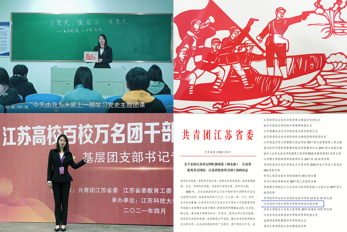 五四前夕,学生社团党支部党员、非遗协会团支书申旋旋以“血色航线”为主题,为同学们上了一堂“大学生如何传承红色基因、坚定理想信念”的主题团课。她通过手中的小沙东海战剪纸作品深情讲述了发生在连云港的党史上那段“新四军用木船对抗日军的铁艇”悲壮故事。随后又在抗日山小沙东海战烈士冢前进行了实景教学。凭借本次团课,申旋旋同学获得了江苏高校百校万名团干部思政技能大比武基层团支部书记专项赛三等奖。非遗协会团支部也荣获“江苏省五四红旗团支部”表彰。
