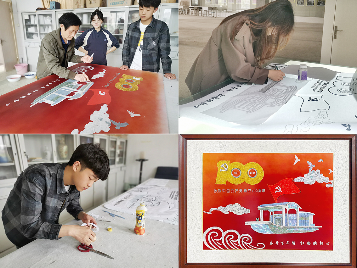 五一小长假,学生社团党支部党员、非遗协会副会长陈润欣等同学走进赣榆张西月贝雕工作室,在省非遗传承人张西月老师的指导下开始了建党100周年主题贝雕制作。他们运用螺钿工艺制作了“红船映初心”贝贴画制作。历时多日,这幅长1.2米宽0.9米,全程由学生自行设计制作的贝雕作品顺利完工。作品生动展示了蕴含“开天辟地、敢为人先的首创精神,坚定理想、百折不挠的奋斗精神,立党为公、忠诚为民的奉献精神”的伟大红船精神。