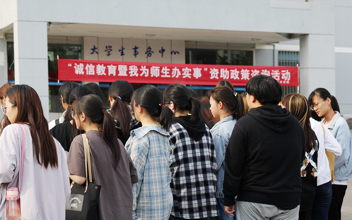 5月21日在厚德楼前开展“诚信教育暨我为师生办实事—资助政策咨询”活动,及时解答学生关于助学金网上申请流程、助学贷款诚信还款流程、勤工俭学等相关问题,缓解了经济困难学生在校学习生活的实际问题。