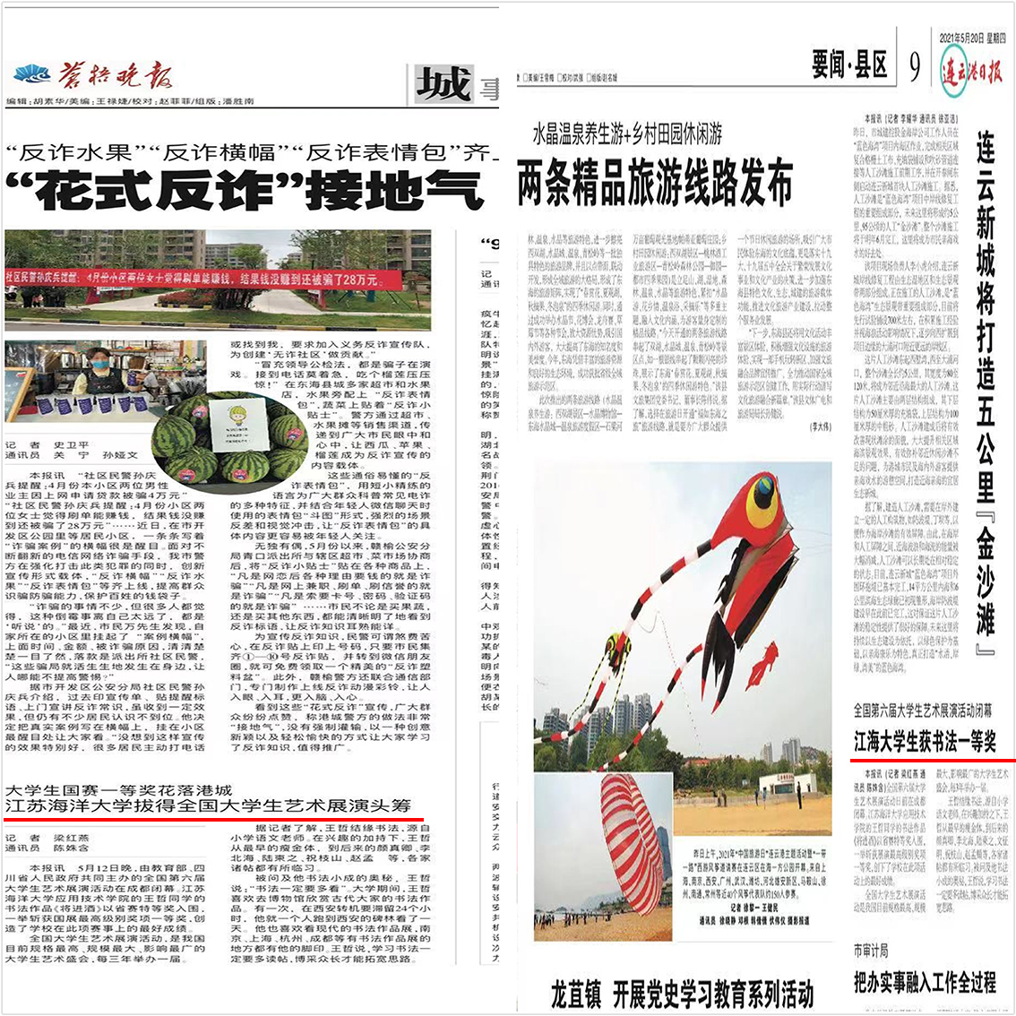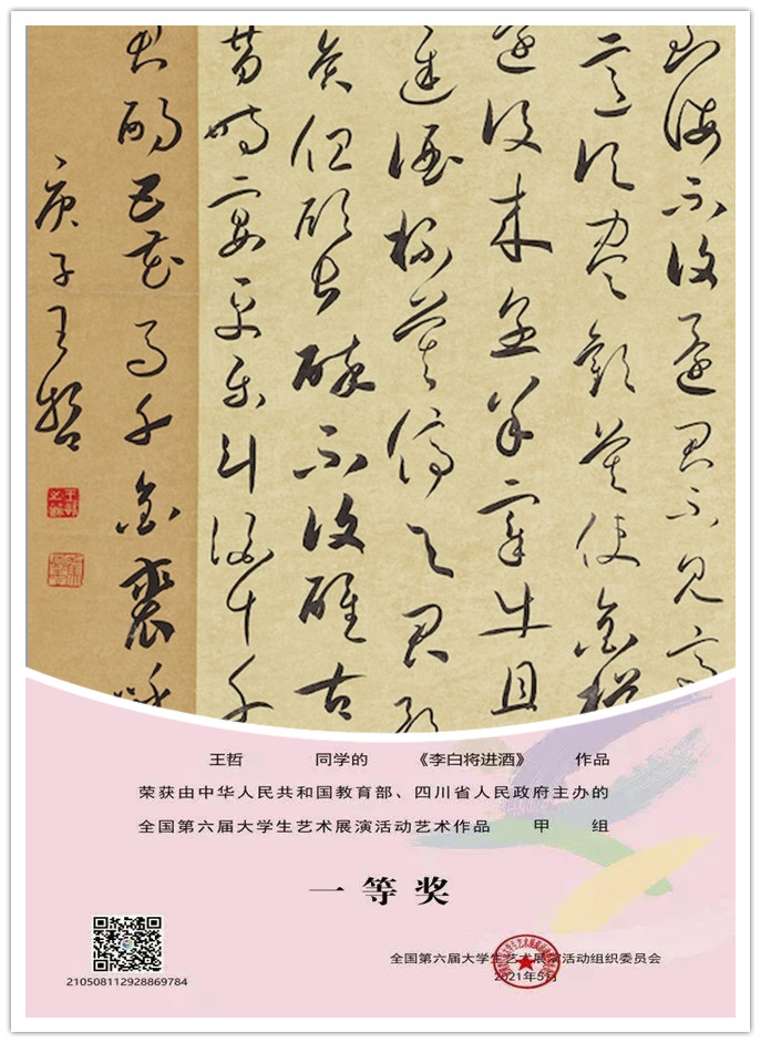 日前,由教育部、四川省人民政府共同主办的全国第六届大学生艺术展演活动在成都闭幕。我院Z计算机172班级王哲同学的书法作品《将进酒》以省赛特等奖入围,一举斩获国展最高级别奖项一等奖,创造了学校在此项赛事上的最好成绩。连云港日报、苍梧晚报等对王哲同学获奖情况进行报道。