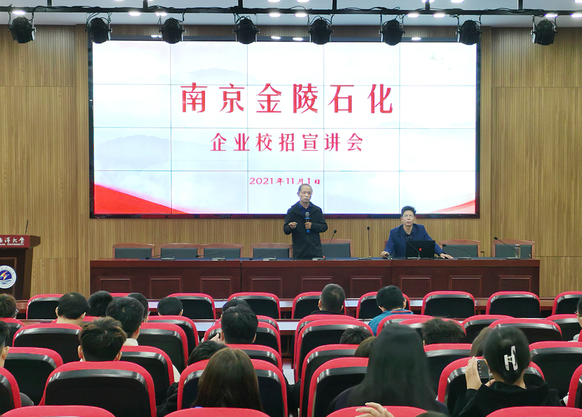 动员会结束后,南京金陵石化公司进行了校招宣讲会,该公司人力资源部王经理向同学们宣讲了企业概况、企业文化、企业发展愿景、招聘岗位、薪资福利等同学们感兴趣的问题。现场还进行了气氛热烈的互动,有多名同学与用人单位进行了洽谈。
