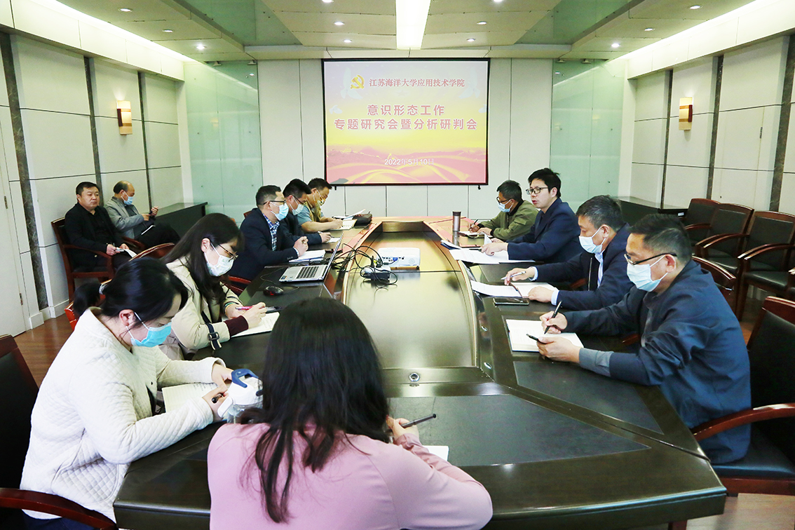 会议学习了习近平总书记关于意识形态工作的重要论述精神。赵求勇传达了中央、省委及省委教育工委近期关于高校意识形态工作有关文件精神,并解读了《中共江苏海洋大学应用技术学院委员会意识形态工作责任制实施细则》(2022版)。与会人员围绕学校意识形态工作现状和当前面临的形势,结合各科室实际情况分别进行了分析研判,并就本学期扎实做好意识形态工作展开讨论,提出意见建议。