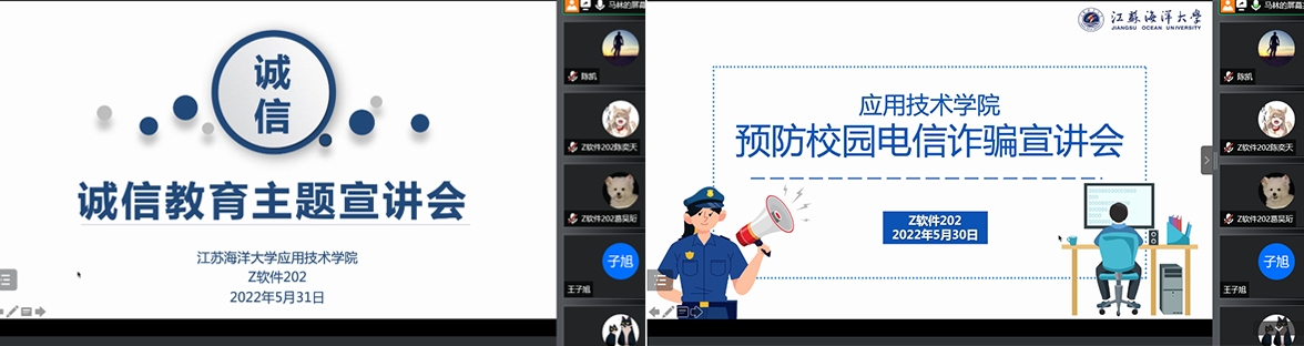 5月27日起,学院各班级陆续组织开展“增强防范意识 远离网络诈骗”主题班会。班长们用丰富、生动的案例,揭露校园贷款、网络购物、网络电信诈骗、网聊交友等常见诈骗的套路与手段,提高同学们的反诈骗意识。学院还积极动员学生下载“国家反诈中心”APP,运用信息技术手段,提升自我防范能力,减少金融诈骗事件发生。本次主题班会,提高了同学们识骗、防骗、拒骗的安全意识,增强了同学们自我保护和安全防范能力。