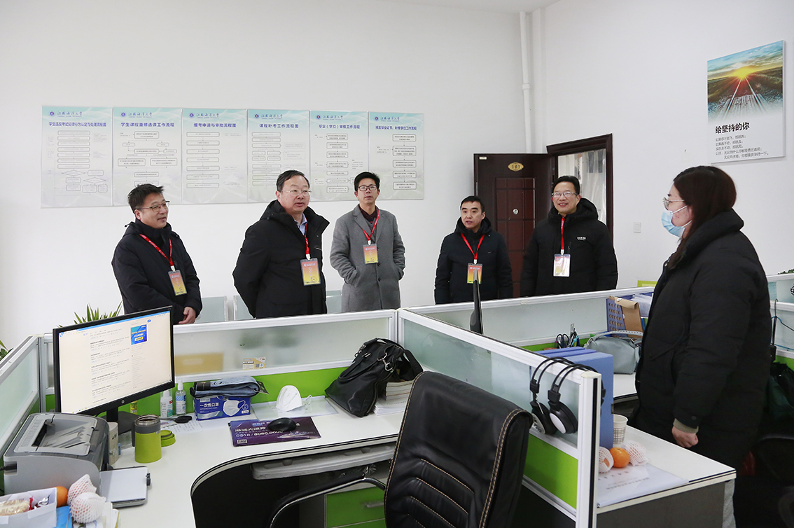 2月13日是开学第一天,为全面了解教学工作运行状态,确保新学期各项教学工作顺利开展,上午8点,校长宁晓明带队到我院对开学工作进行了全面检查,教学质量管理处处长乔斌、学院党委书记赵求勇、院长张根友、副院长隋福利全程陪同检查。