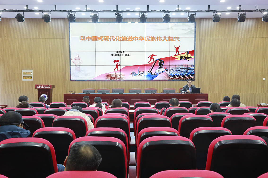 崔家新做了题为《以中国式现代化推进中华民族伟大复兴》的辅导报告。报告中,他从接续奋斗,追求千年梦想;立足国情,开辟全新道路;凝心聚力,推进复兴伟业三个方面展开,用翔实的数据和鲜明的案例论述了中国式现代化的历史、科学内涵以及如何走好中国式现代化。