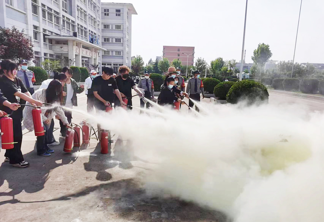 讲座后,师生一起来到正通广场开展了消防灭火演练,保卫科工作人员现场讲解了干粉灭火器的使用方法,同学们纷纷按照“提、拔、握、压”的使用要诀对准火盆灭火作业,学院志愿消防队员还为现场的师生做了消防车消火栓灭火演练。