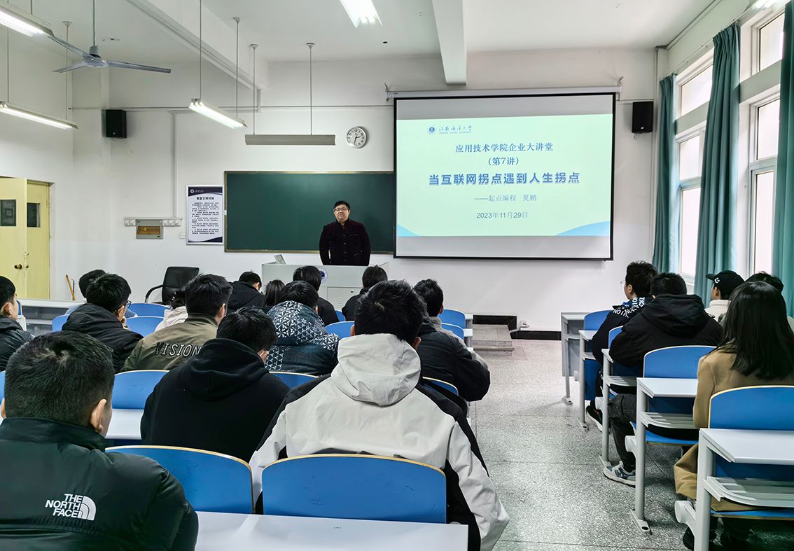 11月29日下午,学院在敦行楼111开展“企业大讲堂”第7讲“当互联网拐点遇到人生拐点”,江苏极刻知学信息技术有限公司总经理夏鹏应邀主讲,2022级计算机专业专转本学生参加,讲座由校企办主任方璐主持。