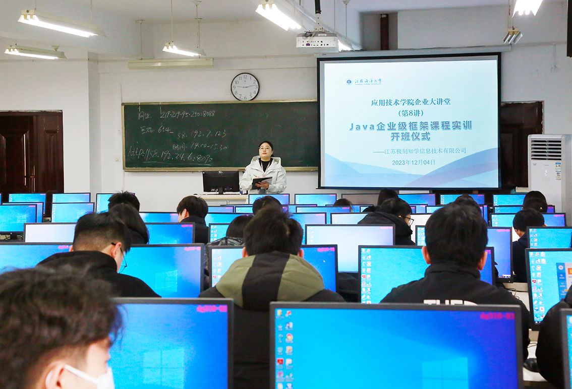 12月4日上午,学院在敦行楼310开展“企业大讲堂”第8讲“Java企业级框架课程实训”,江苏极刻知学信息技术有限公司总经理杜小丽应邀主讲,2020级计算机专业对口单招学生参加。