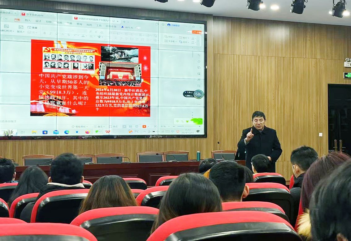 银发思政课照亮青年理想。在银发思政课堂上,头发花白却精神矍铄的历史学副教授张明祖老师以“中国历史为什么选择中国共产党”为题,从以史为鉴,追溯历史脉络中的必然抉择;使命担当,中国共产党的先进性与独特优势;人民至上,赢得民心铸就历史伟业;展望未来,传承红色基因砥砺奋进新征程四个方面深入浅出的解读中国共产党是历史和人民的必然选择。整堂思政课内容丰富,既有深刻的历史分析,又有鲜活的现实案例;既有理论的高度,又有实践的深度。同学们全神贯注地聆听,积极参与互动交流。这堂银发思政课不仅让同学们对中国历史选择中国共产党的内在逻辑有了更为清晰的认识和理解,更激发了同学们的爱党爱国情怀和为实现中华民族伟大复兴而努力奋斗的决心与信心。