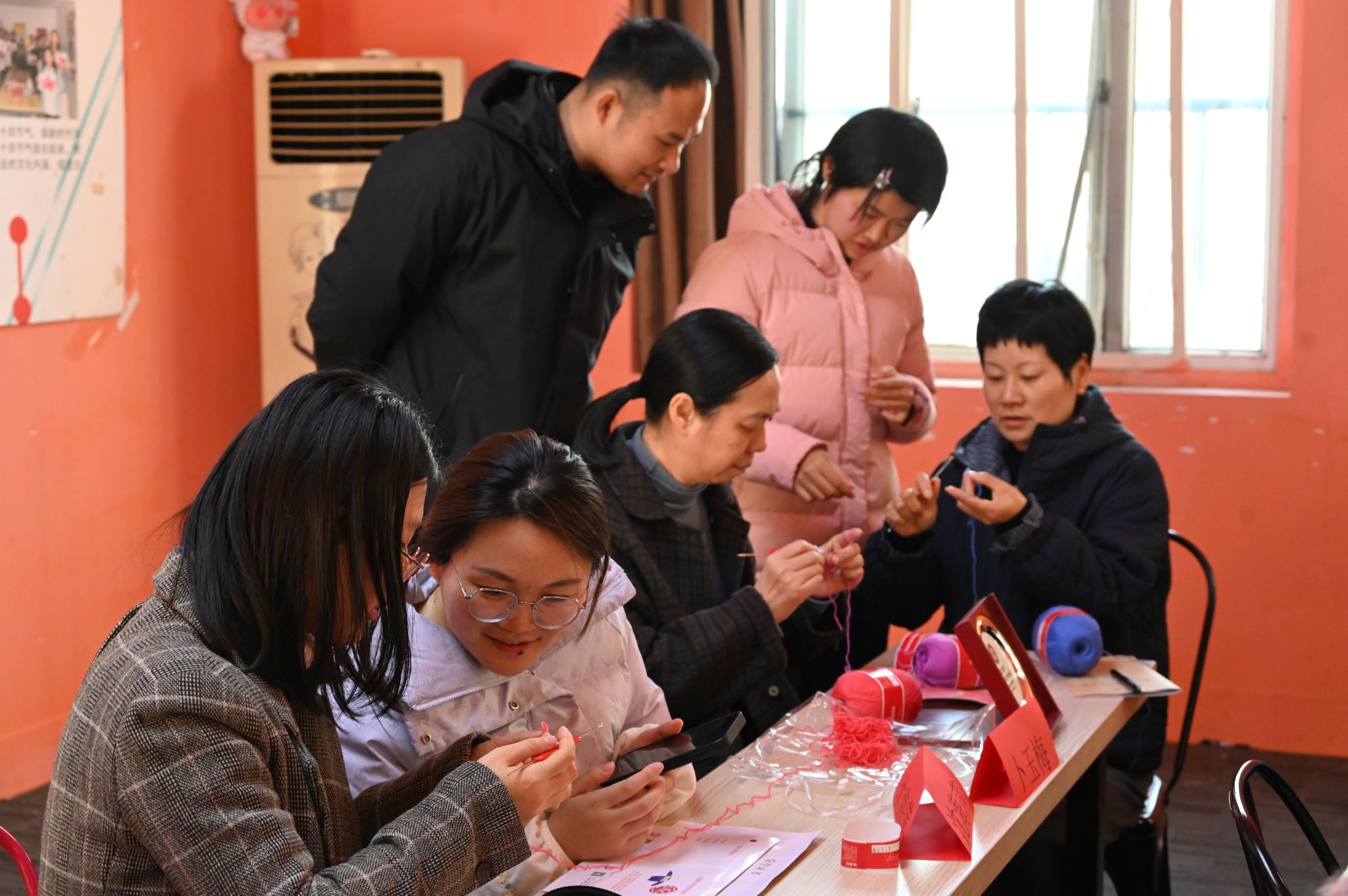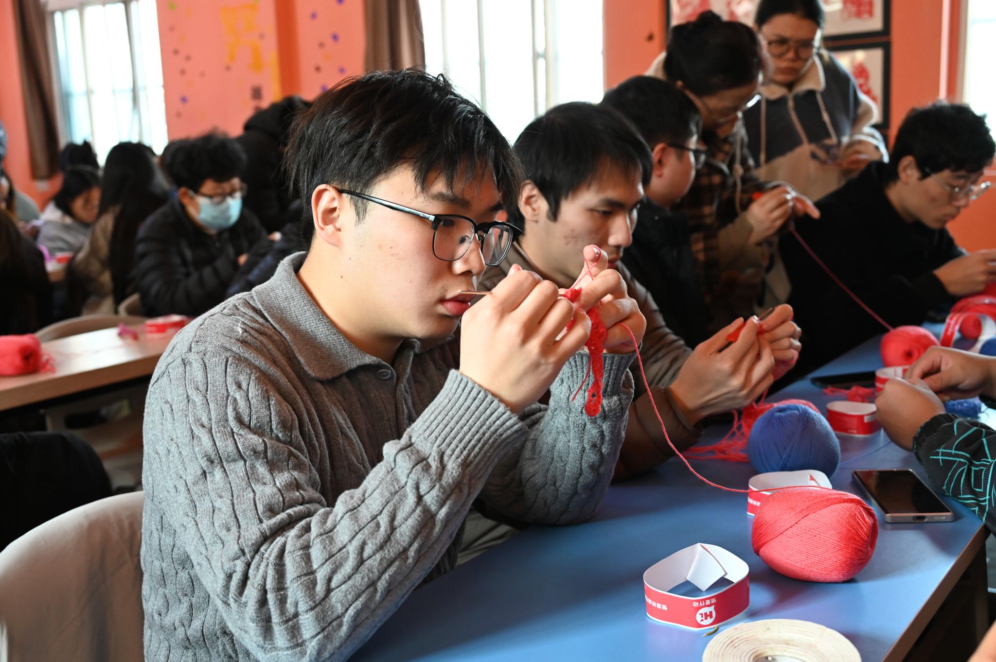 公益活动延续至下午。党支部组织开展了“党员巧手织温暖,恒爱行动献真情”活动,学生党员、学院教职工、非遗协会同学与物业宿管阿姨们在沈海萍的指导下,认真学习钩织技艺。五彩绒线在指尖流转,一针一线凝聚着对新疆边远地区孤困儿童的深切关怀与美好祝愿。