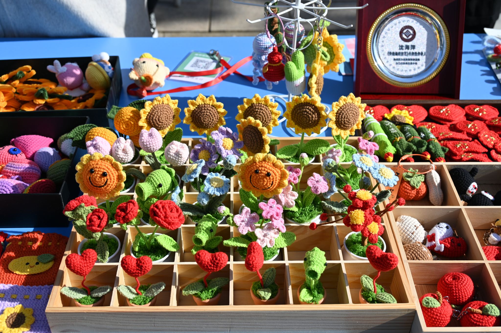 中午时分,宋跳校区食堂东门前氛围热烈。“党旗引领,巧手共融:非遗传承助力残健融合校园义卖会”顺利开展。展台上陈列有吉祥结、西游主题玩偶、编织围巾等手工艺品,均由心智障碍青年在非遗传承人沈海萍及学生志愿者的指导下完成。这些作品门类丰富、制作精良,充分展现出匠心精神与意志力量。师生纷纷驻足选购,以实际购买行动支持心智障碍群体,传递温暖与尊重。