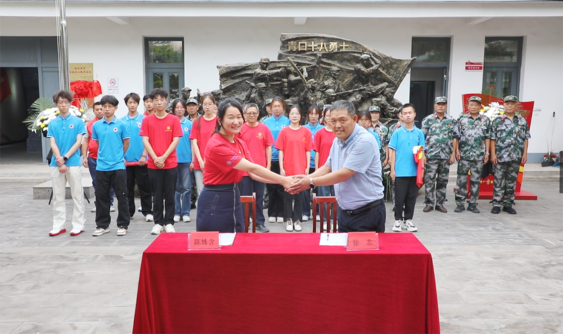 王永跃致欢迎词,表达了通过与高校党支部共建,为传承红色文化注入青春力量的期待。在全体人员的见证下,青口镇退役军人服务站党支部书记徐志与学院学生社团党支部书记陈姝含签署共建协议。根据协议,双方将围绕“组织联建、资源共享、品牌共创”展开合作,形成理论学习、实践体验、文化传播的育人闭环。随后时树奎与顾星共同为“党员实践教育基地”揭牌。根据共建计划,学生社团党支部将选拔30余名党员及积极分子组建“红色讲解员”队伍,接受纪念馆专业培训后,定期为参观者讲述 “青口十八勇士”不畏强暴、血战到底的革命事迹。