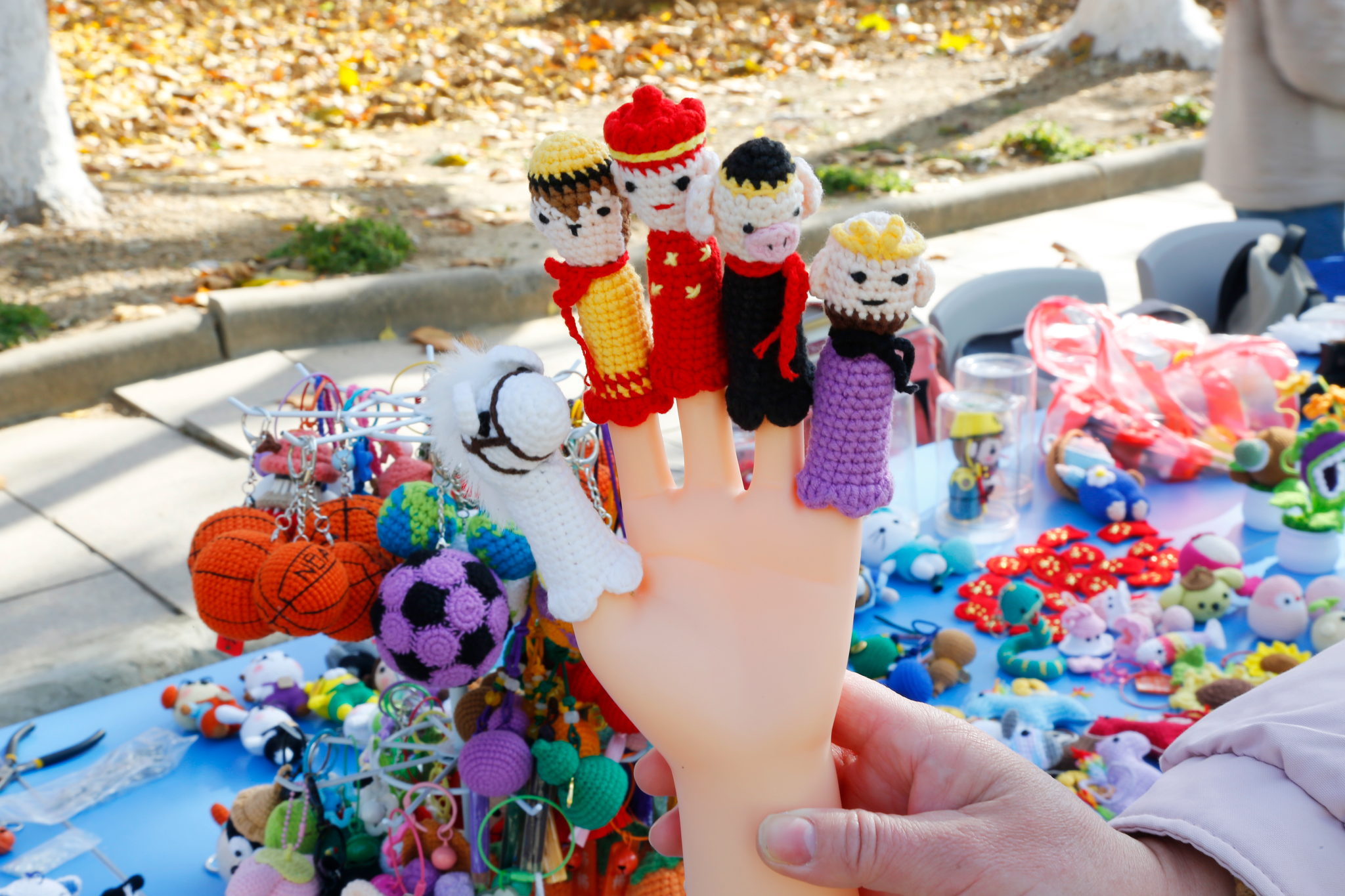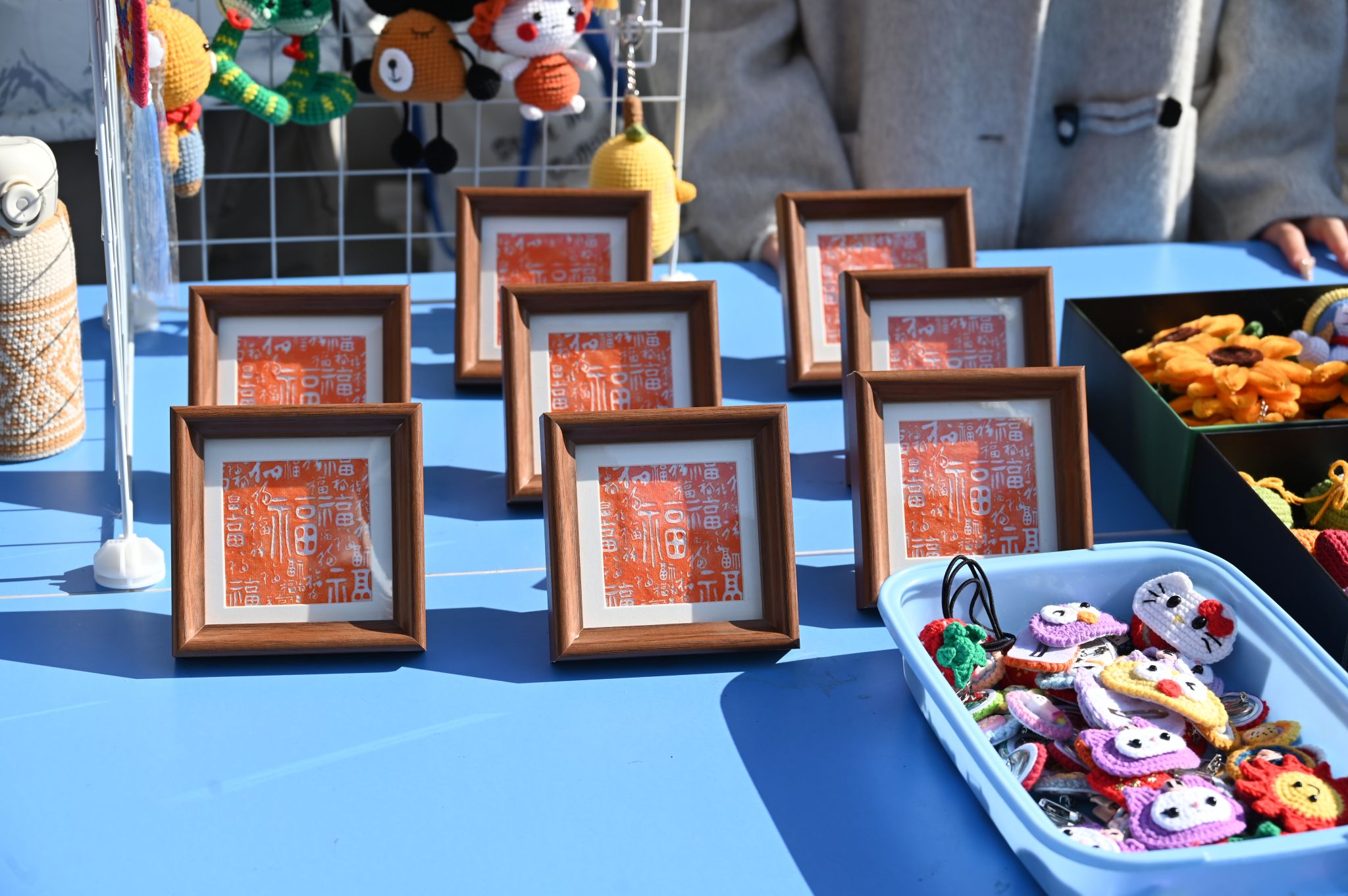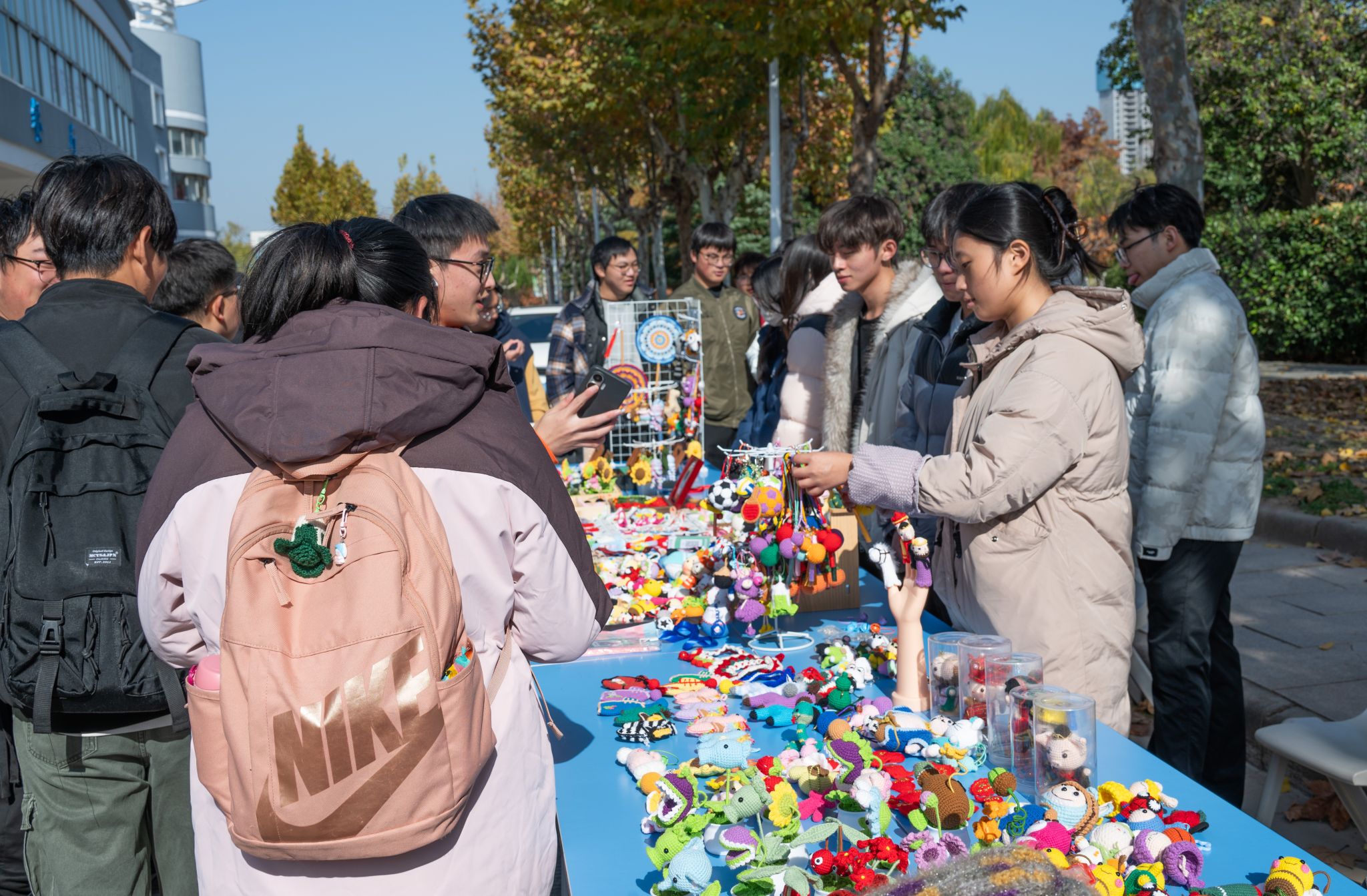 中午时分,宋跳校区食堂东门前氛围热烈。“党旗引领,巧手共融:非遗传承助力残健融合校园义卖会”顺利开展。展台上陈列有吉祥结、西游主题玩偶、编织围巾等手工艺品,均由心智障碍青年在非遗传承人沈海萍及学生志愿者的指导下完成。这些作品门类丰富、制作精良,充分展现出匠心精神与意志力量。师生纷纷驻足选购,以实际购买行动支持心智障碍群体,传递温暖与尊重。