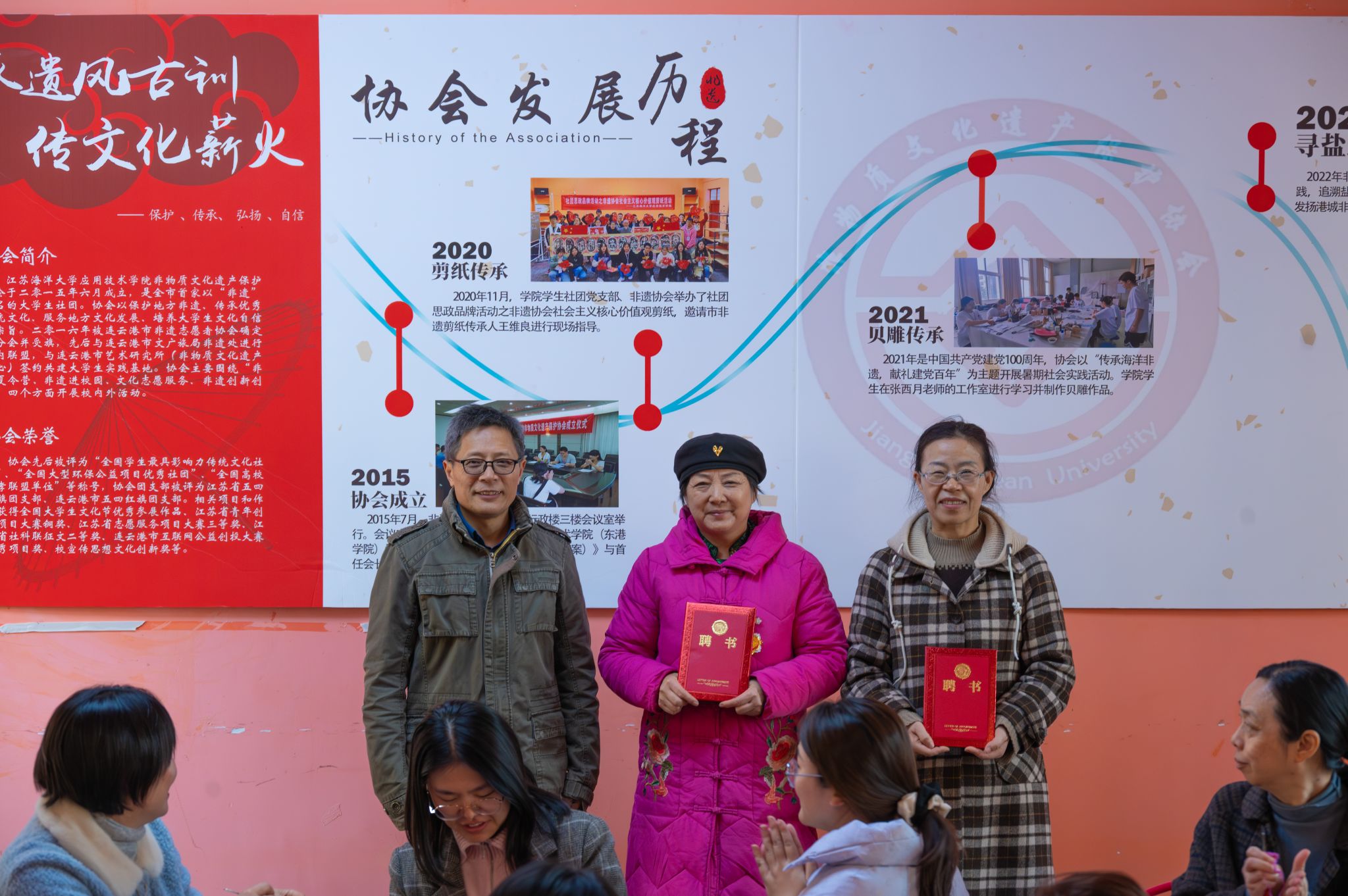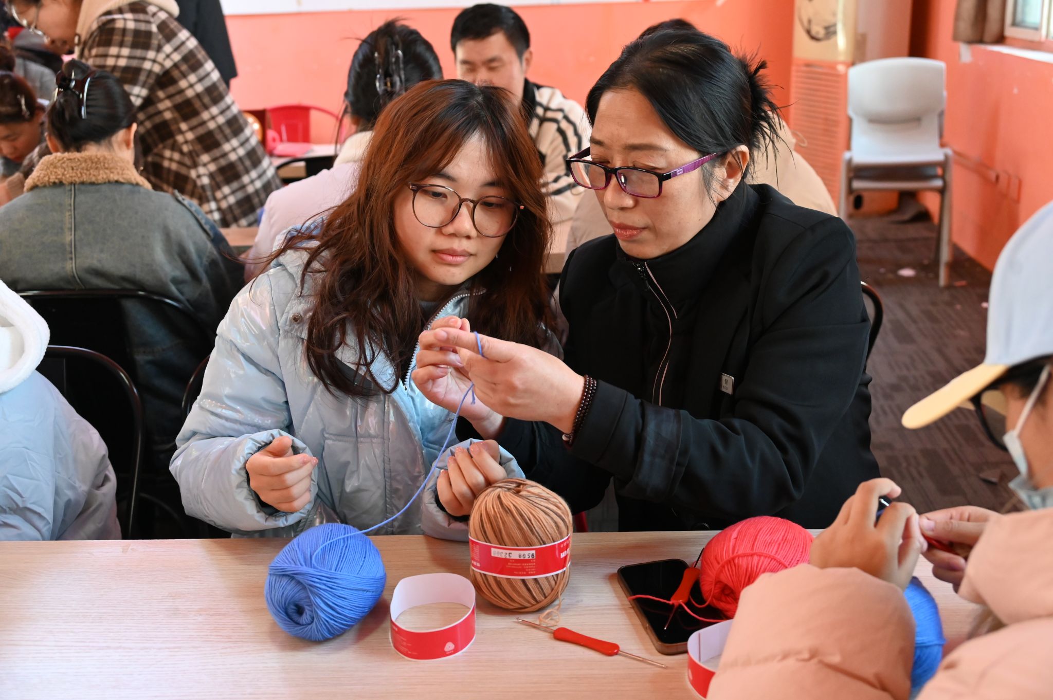 公益活动延续至下午。党支部组织开展了“党员巧手织温暖,恒爱行动献真情”活动,学生党员、学院教职工、非遗协会同学与物业宿管阿姨们在沈海萍的指导下,认真学习钩织技艺。五彩绒线在指尖流转,一针一线凝聚着对新疆边远地区孤困儿童的深切关怀与美好祝愿。