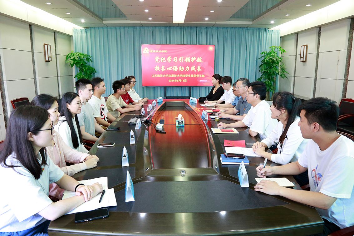 为深入学习贯彻习近平总书记关于青年工作的重要思想,推动党纪学习教育走深走实,引导学生党员扣好纪律的“第一粒扣子”,6月14日下午,学院学生社团党支部在行政楼三楼会议室举行“党纪学习引领护航,校长心语助力成长”主题党日活动。校长宁晓明以支部普通党员身份参加支部活动,并与支部党员亲切座谈。