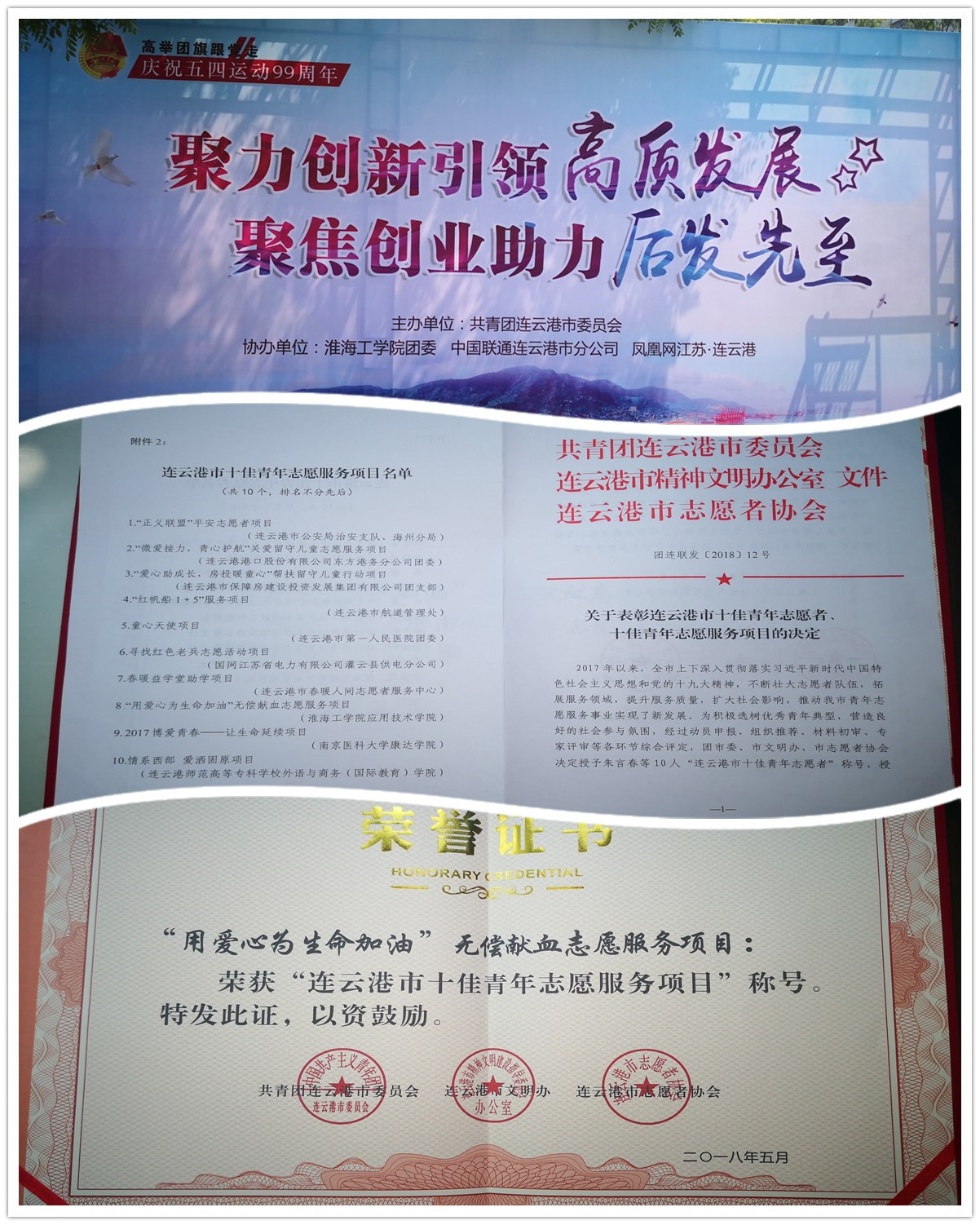 近日,由共青团连云港市委、连云港市文明办、连云港市志愿者协会组织开展的连云港市十佳志愿行动评选表彰活动结果揭晓,通过组织申报、材料初审、专家评审等环节,我院“用爱心为生命加油”无偿献血志愿服务项目,荣获连云港市十佳青年志愿服务项目殊荣。5月3日下午,团市委在我校举办“聚力创新引领高质发展聚焦创业助力后发先至”“五四”青年节系列活动,仪式现场对获奖项目进行了颁奖。