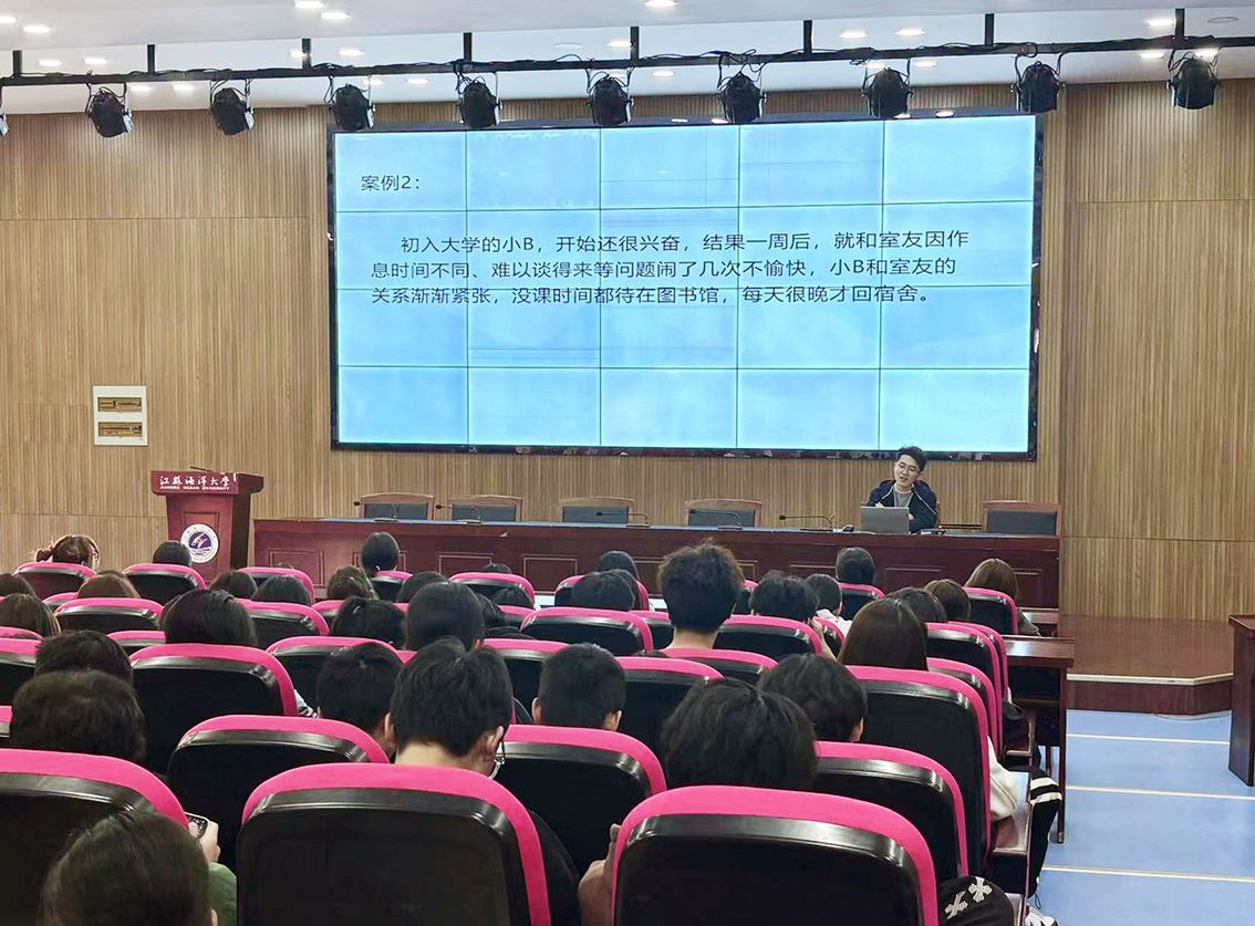 讲座伊始,邹翔宇结合自身的心理健康教育经验和实际案例,详细介绍了同学们进入大学后可能会遇到的在学习、交往、情感、目标、享乐等方面的“暗礁”。紧接着,邹翔宇对新生适应方面给予建议,在生活方面要量入为出、自我照顾,在学习方面要适应变化、转变方式,在人际交往方面要求同存异、和谐共处,在职业规划方面要找到航向,确定目标。之后,邹翔宇向同学们详细介绍了三种适应新生活的策略:一是摆正心态不恐慌;二是积极自助不依赖;三是主动求助不放弃。