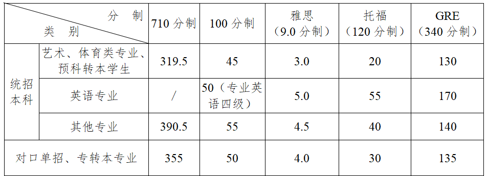 1. 普通本科生外语水平达到相应要求(见下表)。对于退役士兵录取及复学的学生,其外语水平不做要求。