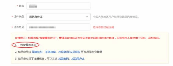 填写证件号码后,如果提示证件号码已被注册,请按照附件2进行问题处理。