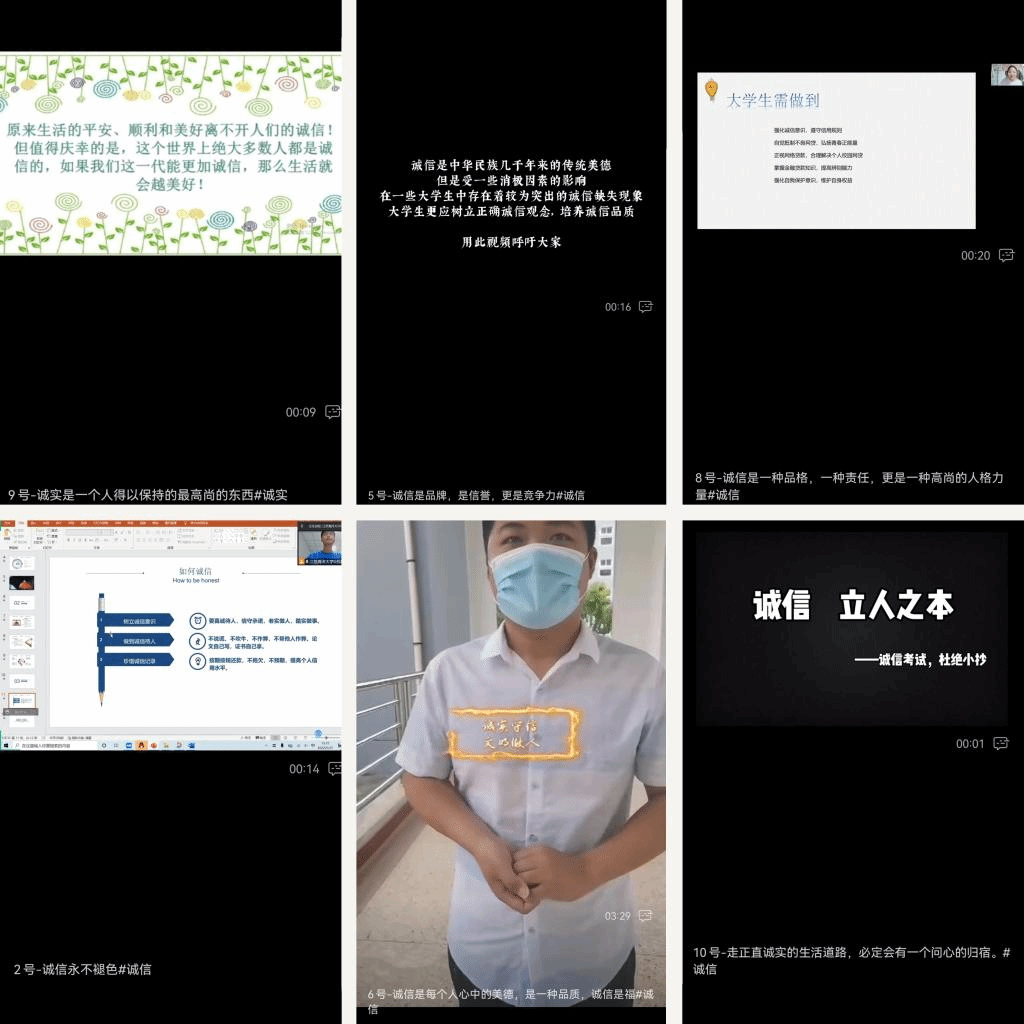 运用新媒体技术强化诚信教育实效。学院开展“诚信故事我来说,诚信行为大家做”诚信微视频评选活动,35组诚信主题教育短视频,喻教育于生活,通过生动形象的故事演绎、引人深思的生动演讲,新媒体、官Q等网络平台对活动进行了广泛宣传,在全院范围内营造了守信光荣、失信可耻的良好氛围,充分发挥了新媒体新技术的育人载体功能。