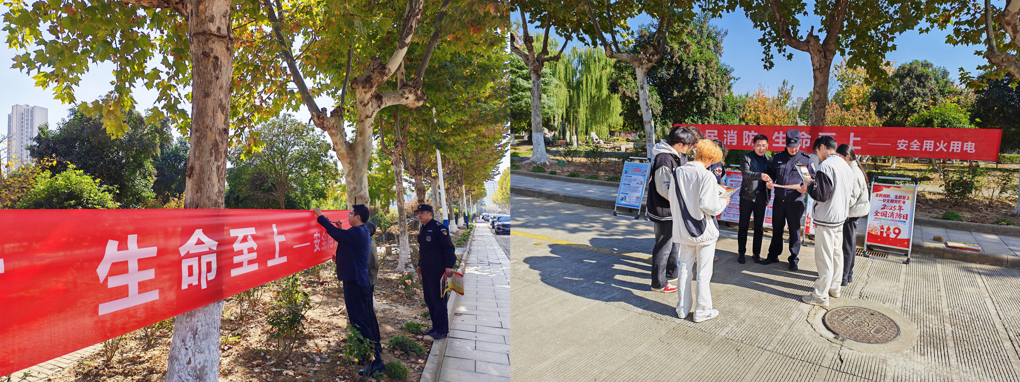 依托校园电子显示屏,循环播放消防安全宣传视频。通过班级微信、QQ群推送消防宣传短剧。校园内学生公寓区域设置消防安全知识展板7块,横幅5条。11月12日学院四海广场举行的消防签名活动中,100多名师生在 “全民消防生命至上——安全用火用电”的横幅上郑重签名,发放消防安全知识宣传单近1000份。