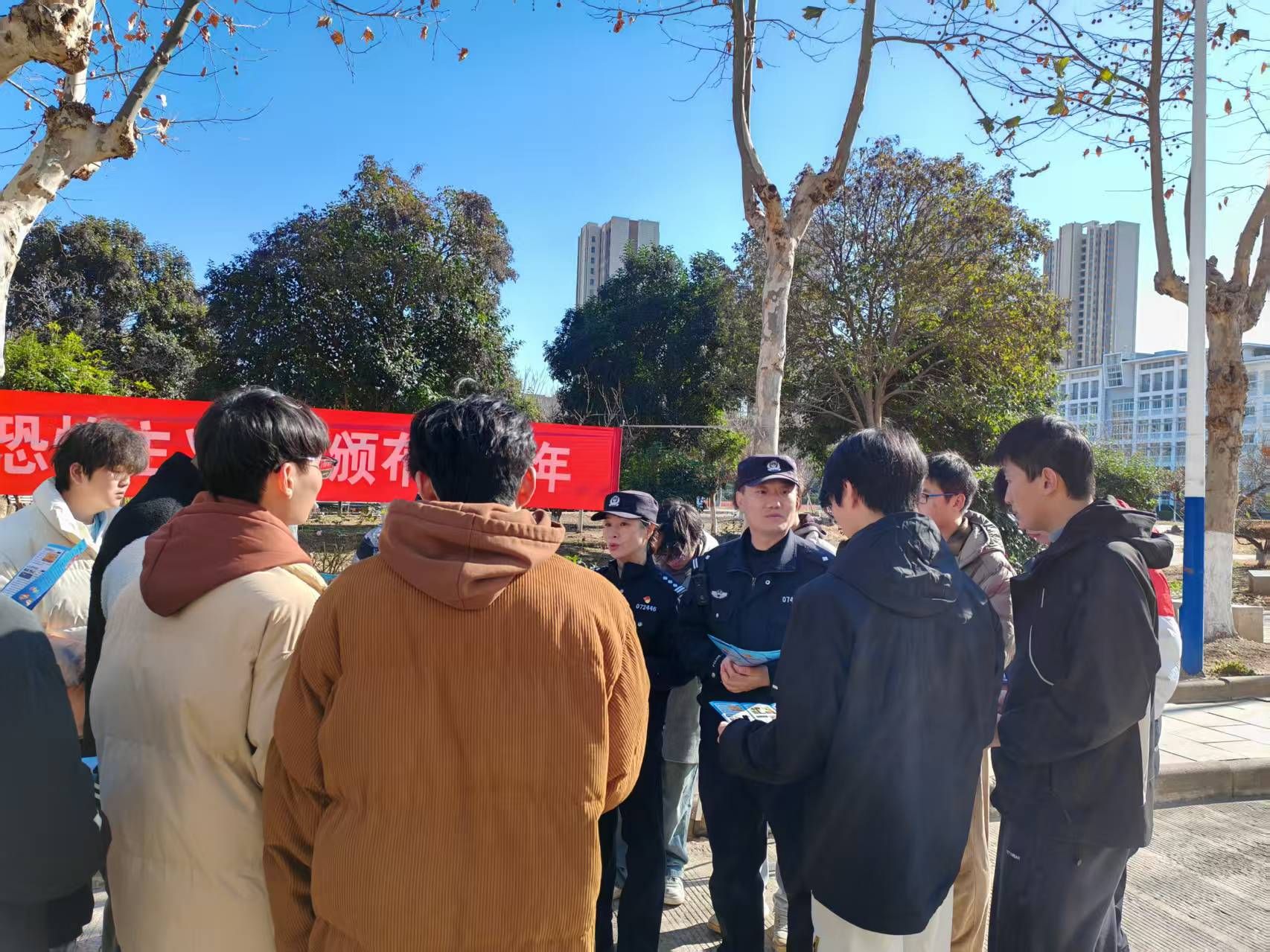 活动现场气氛热烈。高新分局内保大队副大队长王媛媛和社区民警刘学超在厚德楼206室,为学校师生员工详细讲解了《反恐怖主义法》颁布十年来我国的反恐形势以及相关反恐知识,并播放了反恐普法视频,让师生们有更直观的感受。同时,在食堂东侧摆放了反恐、反诈普法展板,吸引众多师生驻足观看。工作人员还向过往师生分发普法传单,积极宣传普法知识,耐心解答大家的疑问。路过的师生纷纷在“全民反恐创平安,《反恐怖主义法》颁布10周年”横幅上签名,表达对反恐工作的支持。