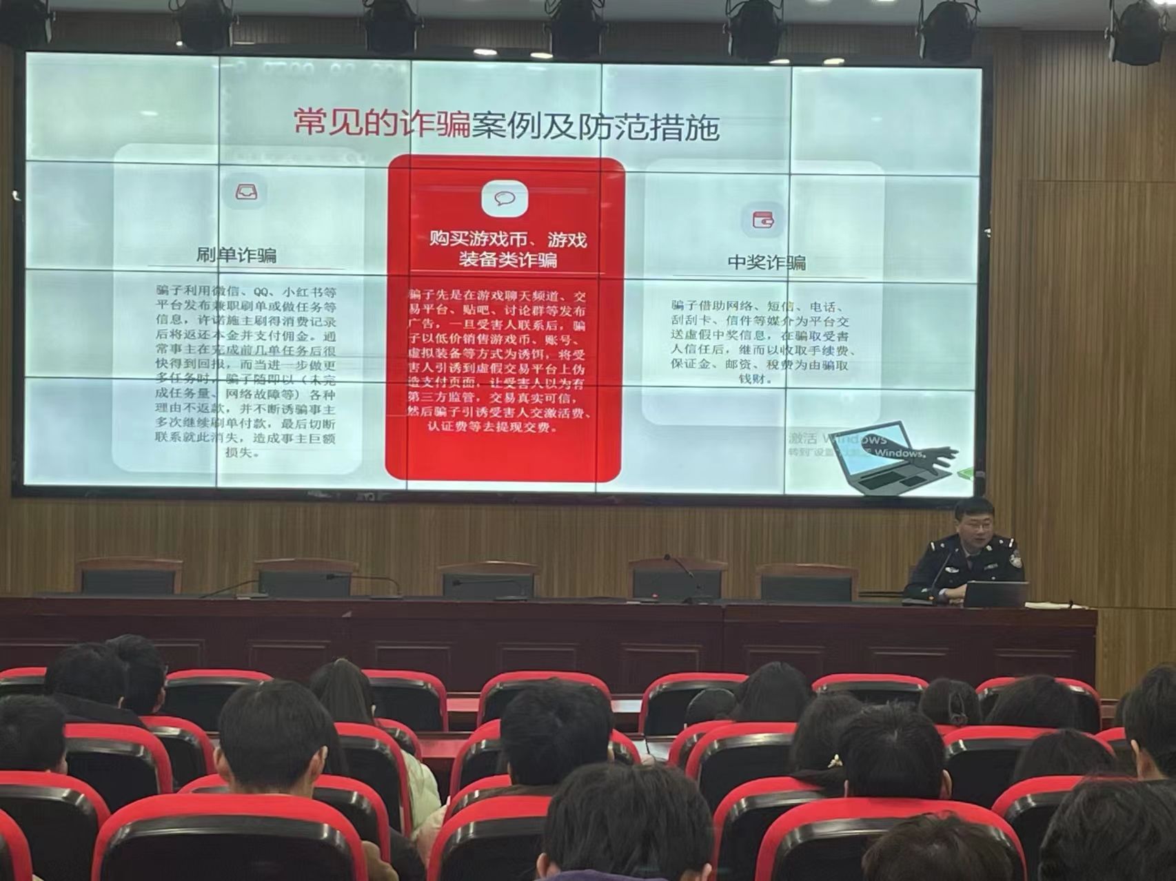 在敦行楼201报告厅,花果山派出所副所长蒋志为200多名同学上“预防电信诈骗安全知识专题讲座”。针对学生安全防范意识相对薄弱的现象,蒋志从电信诈骗的定义入手,结合近年来我市大中专院校学生身上发生过的冒充淘宝客服退款诈骗、网络兼职刷单诈骗、冒充熟人及公检法诈骗、网络交友“裸聊”、网络博彩诈骗等典型真实案例,讲述了诈骗分子惯用的诈骗手段,并针对不同的诈骗形式详细讲解了防范措施。