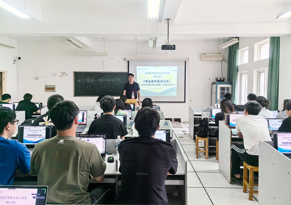 近日,学院在敦行楼205开展了一场别开生面的“企业大讲堂”,特别邀请江苏极刻知学信息技术有限公司java学科负责人王翔讲授实训课程《专业素养基本训练》。课程开篇以“为什么是抖音小程序,它的优势如何”为主题,2022级计算机专业对口单招学生参加。