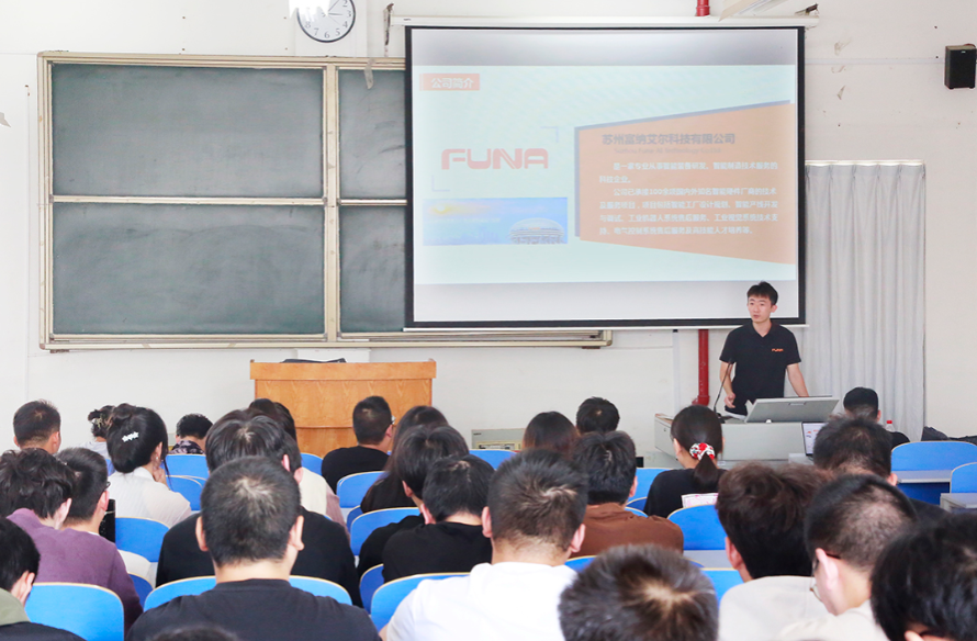 苏州富纳智能科技有限公司人事专员向学生详细展示了公司的基本概况、企业发展情况、产品情况、实习培训及岗位情况、实习生及员工待遇情况、员工发展晋升渠道、员工饮食及住宿条件、企业关怀等情况,并现场与学生进行了互动和问答,加深了学生对企业的深入了解。学生结合自身专业优势和招聘岗位要求,就所关心的职业发展前景和薪资待遇等实际问题与用人单位深入交流,努力为自己寻找满意、适合的顶岗实习和就业岗位。